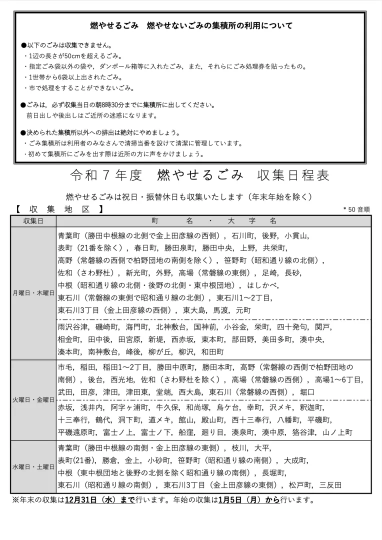 - 燃やせるごみ:12/31まで収集、年始は1/5から再開