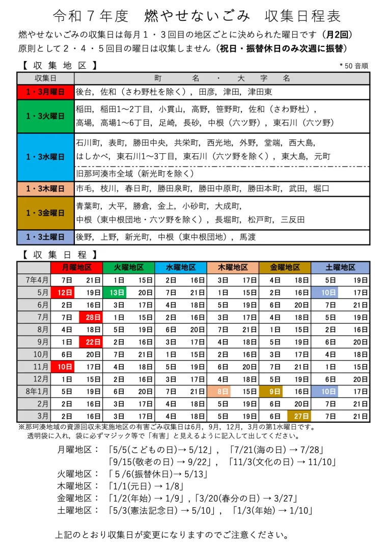 - 燃やせないごみ:1/1〜1/3に該当する地区は翌週へ振替